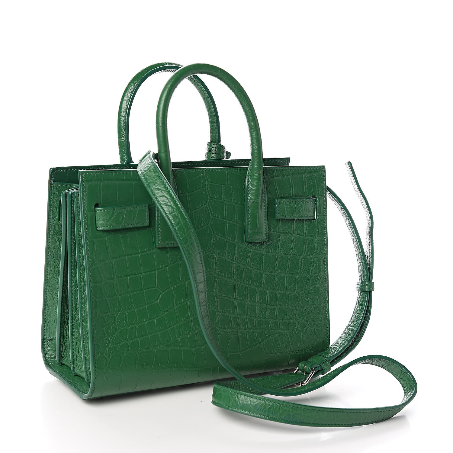 This is a green Nano Sac de Jour made of calfskin embossed with a Saint Laurent Crocodile. This stylish little tote is made of green leather with crocodile stamped on it. The purse has expanding sides, a long, adjustable crossbody shoulder strap, and rolled leather top handles. The top opens to reveal a small, smooth interior made of green leather. With the timeless style that only Saint Laurent can provide, this adorable little tote has space for all of your daytime or nighttime necessities!